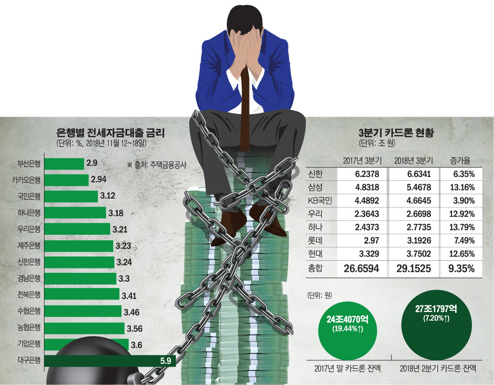 22일 카드사 3분기 공시에 따르면 7개 카드사(신한, 삼성, 현대, KB국민, 롯데, 우리, 하나) 카드론 취급 총액은 29조1525억 원으로 집계됐다. 이는 지난해 3분기 26조6594억 원보다 9.35% 증가한 수치다. 올해 상반기 카드론 누적 잔액 27조1800억 원과 비교하면 약 2조 원(7.2%)가량 늘었고, 지난해 말 카드론 잔액 24조4000억 원과 비교하면 4조5000억 원(19.4%)가량 상승했다. 이는 카드사가 수수료 수익 감소에 따라 이자수익에 의존하는 비중에 치중했기 때문이다.