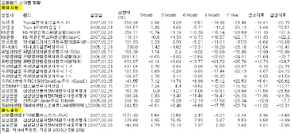 그나마 '피델리티재팬종류형주식-자(A)'가 연초이후 -3.99%로 가장 양호한 수익률을 기록했지만, '삼성당신을위한N재팬주식종류형자 1_C'(-11.86%), '프랭클린템플턴재팬주식형자(E)'(-12.73%), '산은S&P Japan주식 1ClassA'(-12.8%) 등 대부분이 마이너스 10% 이상의 수익률을 보였다.