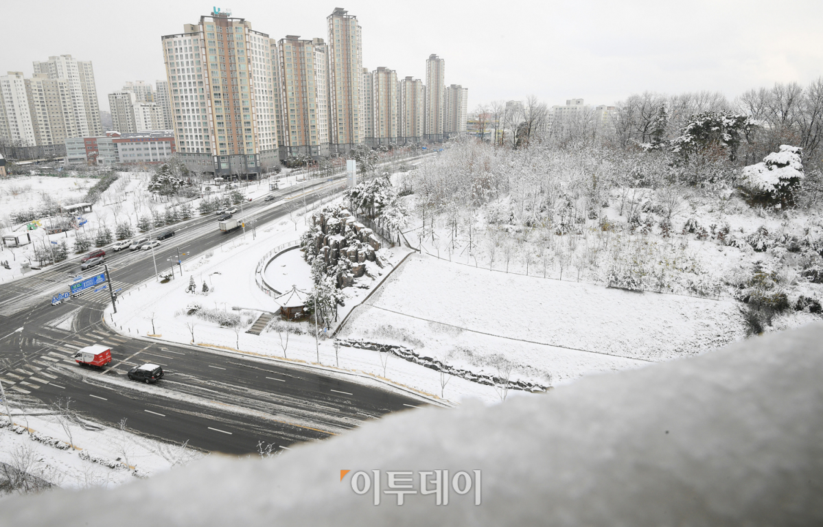 중부지방 곳곳에 첫눈이 내린 24일 오전 경기도 김포시 김포한강신도시에 하얀 눈이 소복이 쌓여 있다. 오승현 기자 story@