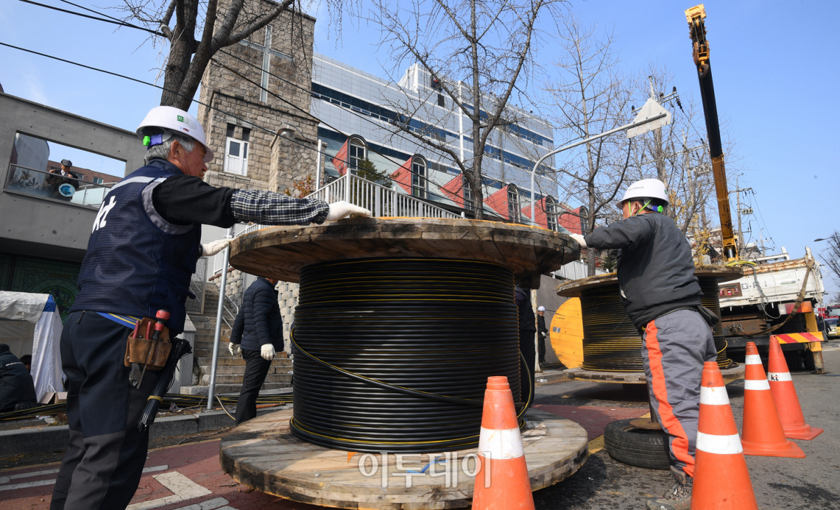 25일 오전 서울 서대문구 충정로 KT 아현지사에서 관계자들이 통신 복구작업에 총력을 기울이고 있다. 소방 당국은 지난 24일 오전 11시 12분께 KT 아현지사 건물 지하 통신구(케이블 부설용 지하도)에서 발생한 화재로 광케이블·동 케이블 150m가 불에 타고, 건물 내부 300㎡가 불에 그을리는 등 80억 원가량의 재산피해가 발생한 것으로 추산했다. 오승현 기자 story@