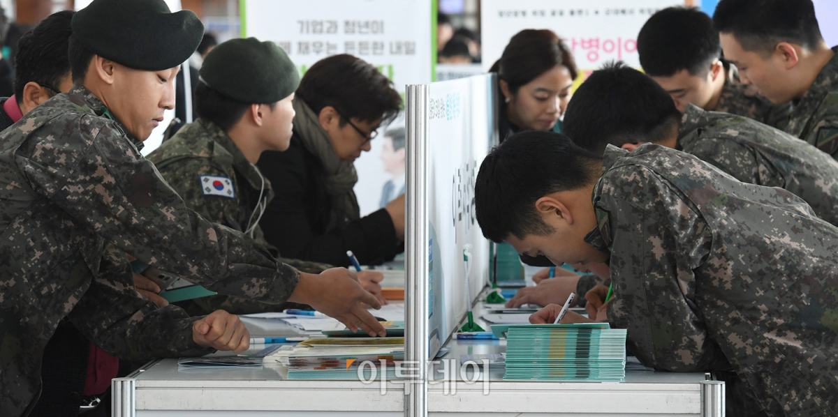 ‘중소기업진흥공단과 코레일이 응원하는 서울 청년 채용 박람회’가 열린 26일 오전 서울역에서 군 장병들이 전역 후의 일자리를 찾고 있다. 코레일 협력사 8개사를 포함해 코레일과 중진공이 추천하는 우수 중소기업 30개사가 참가한 이번 박람회에서 100여 명에게 취업 기회가 주어졌다. 오승현 기자 story@