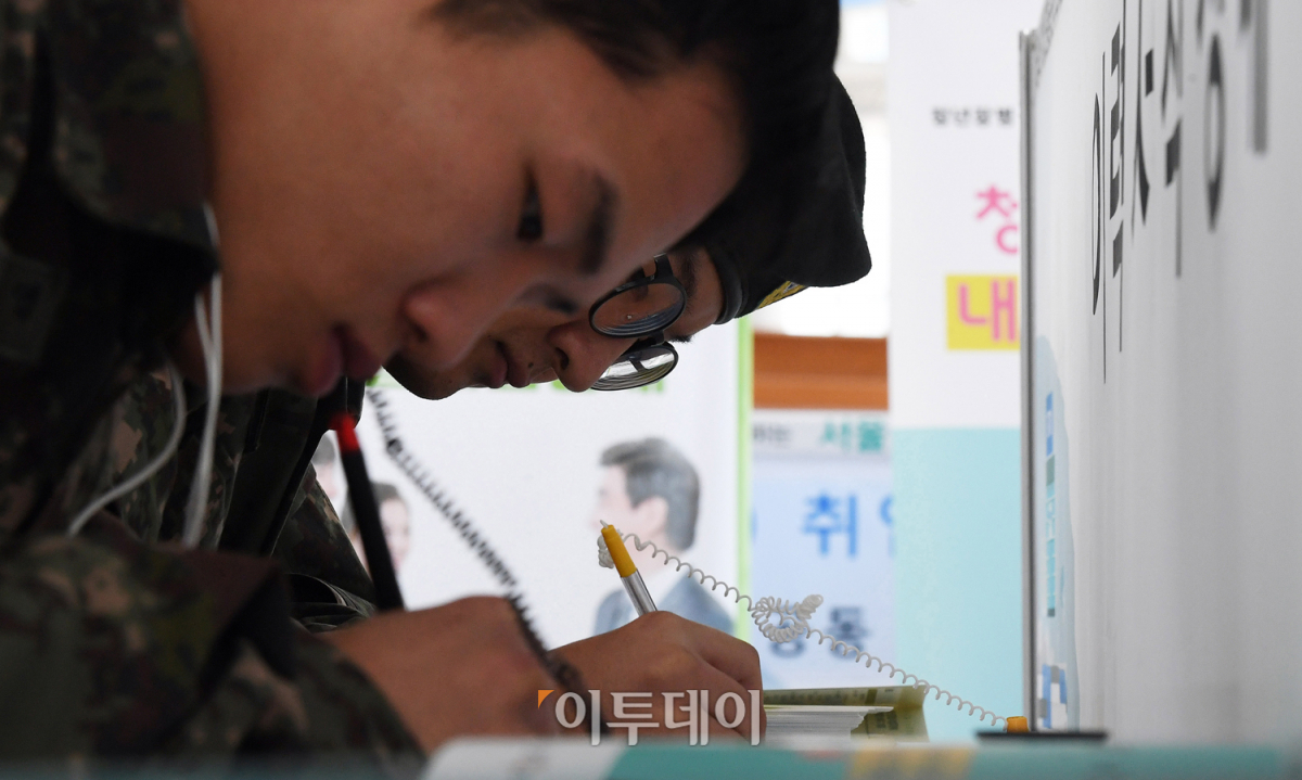 ‘중소기업진흥공단과 코레일이 응원하는 서울 청년 채용 박람회’가 열린 26일 오전 서울역에서 군 장병들이 전역 후의 일자리를 찾고 있다. 코레일 협력사 8개사를 포함해 코레일과 중진공이 추천하는 우수 중소기업 30개사가 참가한 이번 박람회에서 100여 명에게 취업 기회가 주어졌다. 오승현 기자 story@