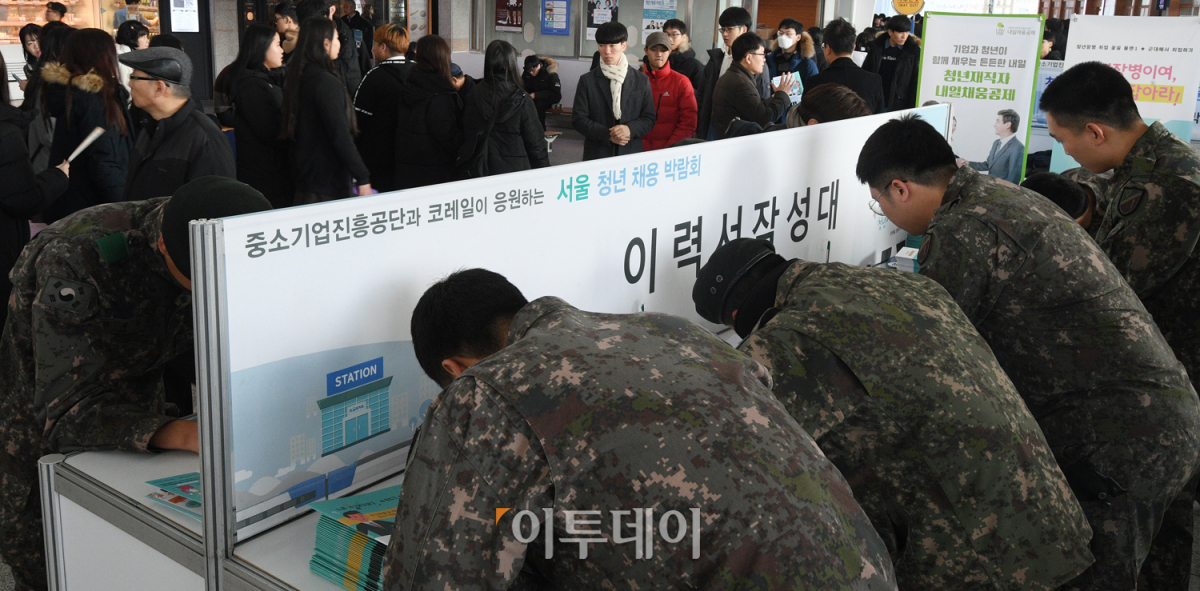 ‘중소기업진흥공단과 코레일이 응원하는 서울 청년 채용 박람회’가 열린 26일 오전 서울역에서 군 장병들이 전역 후의 일자리를 찾고 있다. 코레일 협력사 8개사를 포함해 코레일과 중진공이 추천하는 우수 중소기업 30개사가 참가한 이번 박람회에서 100여 명에게 취업 기회가 주어졌다. 오승현 기자 story@