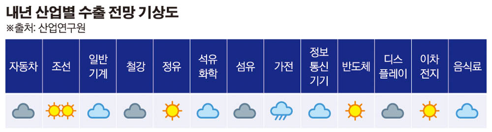 자동차는 0.2%, 가전은 7.5%, 디스플레이는 2.5% 각각 감소할 것으로 분석했다. 또 올해 증가했던 철강은 -3.3%, 섬유는 -0.3%는 각 감소세로 전환할 것으로 예측했다.