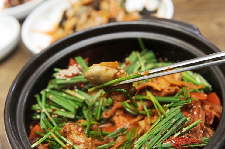 매콤한 양념이 밥에다가 쓱쓱 비벼 먹어도 맛있고, 굴과 돼지고기의 조합이 가히 환상적이다.