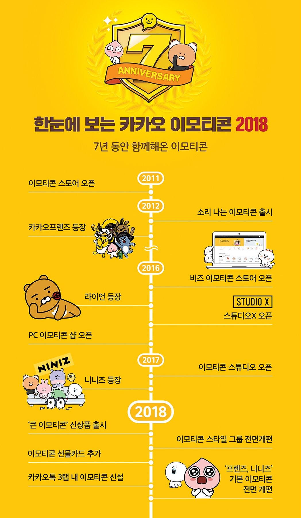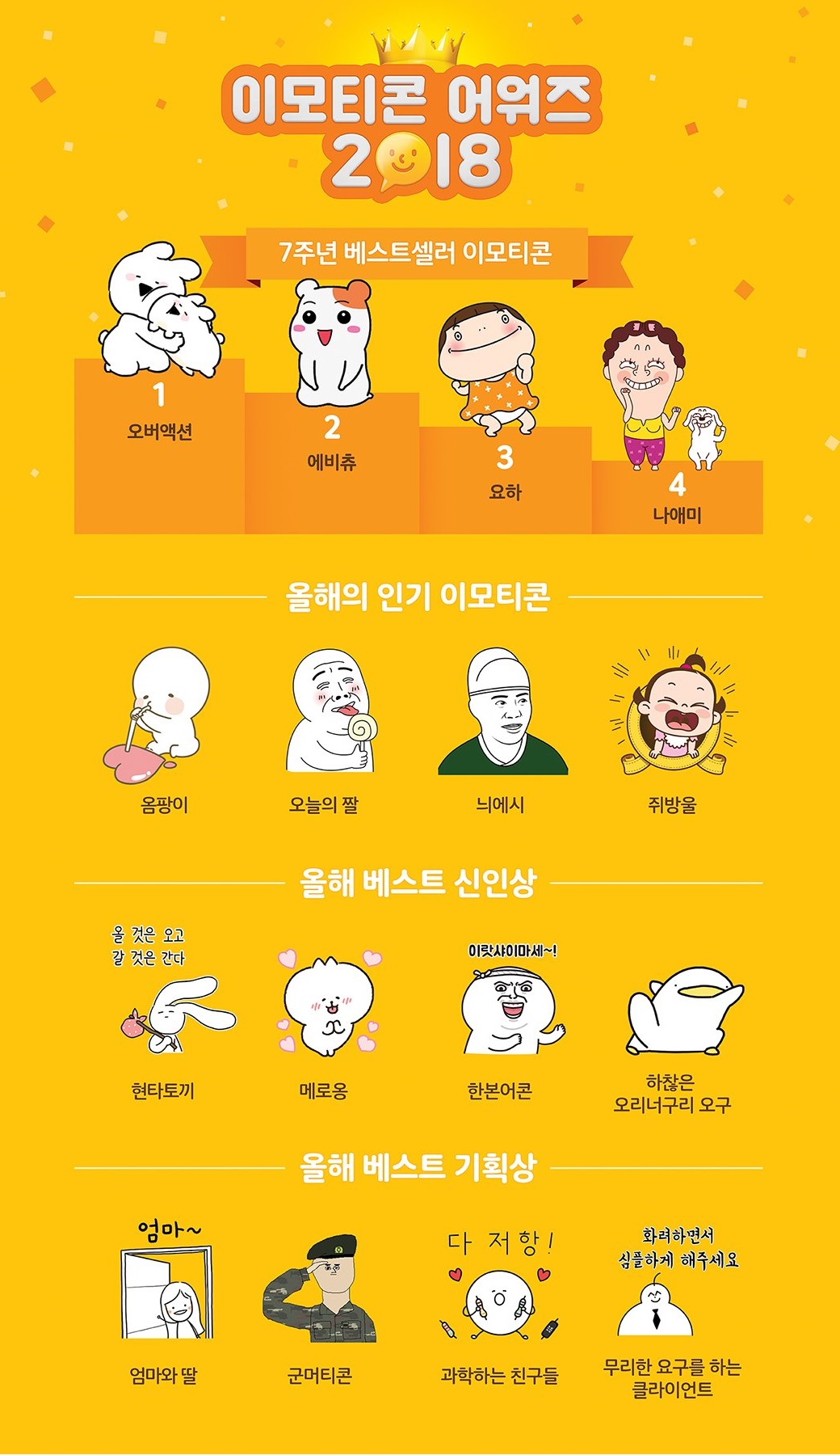 특히 카카오는 이모티콘 출시 7주년을 기념해 ‘이모티콘 어워즈 2018’도 공개했다. 7주년 베스트셀러 이모티콘에는 ‘오버액션(DK)’, ‘에비츄(코글플래닛)’, ‘요하(아포이)’, ‘나애미(주주스)’ 이모티콘이 선정됐으며 ‘옴팡이(애소)’, ‘오늘의 짤(MOH Inc.)’, ‘늬에시(철새)’, ‘쥐방울(한시간컴)’ 등이 인기 이모티콘으로 사랑을 받았다. 베스트 신인상에는 ‘현타토끼(WEEE)’, ‘메로옹(라타)’, ‘한본어콘(수팡)’, ‘하찮은 오리너구리 오구(문종범)’가 선정됐으며 베스트 기획상에는 ‘엄마와 딸(손혜린)’, ‘군머티콘(이걸누가사)’, ‘과학하는 친구들(한지민)’, ‘무리한 요구를 하는 클라이언트(M06B)’ 작품이 선정됐다.