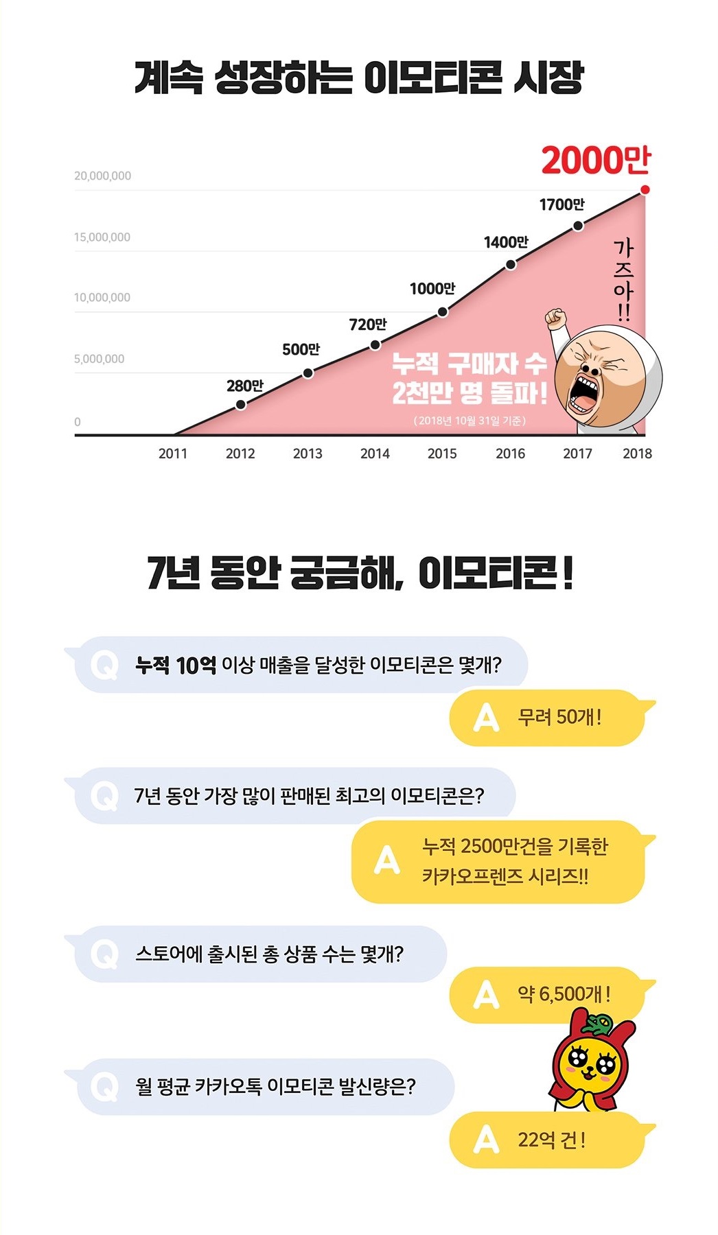 총 누적 구매자는 2015년 1000만 명을 넘어선지 3년만에 2000만 명을 돌파하며 매년 증가하는 추세다. 또 월 평균 사용되는 이모티콘 메시지는 22억 건에 달하며 매달 2700만 명이 이모티콘을 사용해 대화를 이어간다.