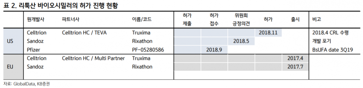 현재 가장 가까운 경쟁자로는 화이자의 PF-05280586가 예상된다. 9월 FDA에 허가 신청서를 접수했으며, 예상 허가 시기는 내년 3분기로 트룩시마와의 격차는 최소 7개월 이상 발생한다.