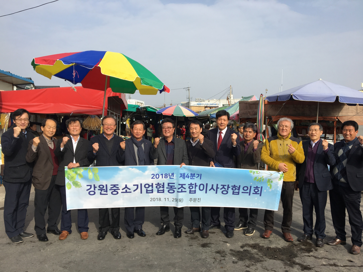 강원중소기업이사장협의회(회장 최돈진) 는 29일 주문진 파도식당에서 회의를 개최하고, 강원 경제 활성화를 위해 춘천 레고랜드사업의 조속한 착공을 촉구하기로 결의했다. 참가자들이 기념촬영을 하고 있다.