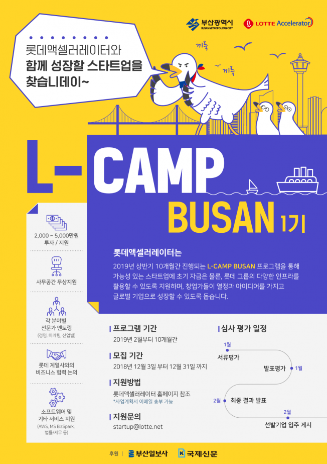 롯데액셀러레이터가 지난 2016년부터 운영해온 스타트업 종합지원프로그램인 L-CAMP(엘캠프)의 모델을 부산 지역으로 확대, ‘L-CAMP BUSAN’에 참가할 스타트업 모집을 3일부터 시작한다.