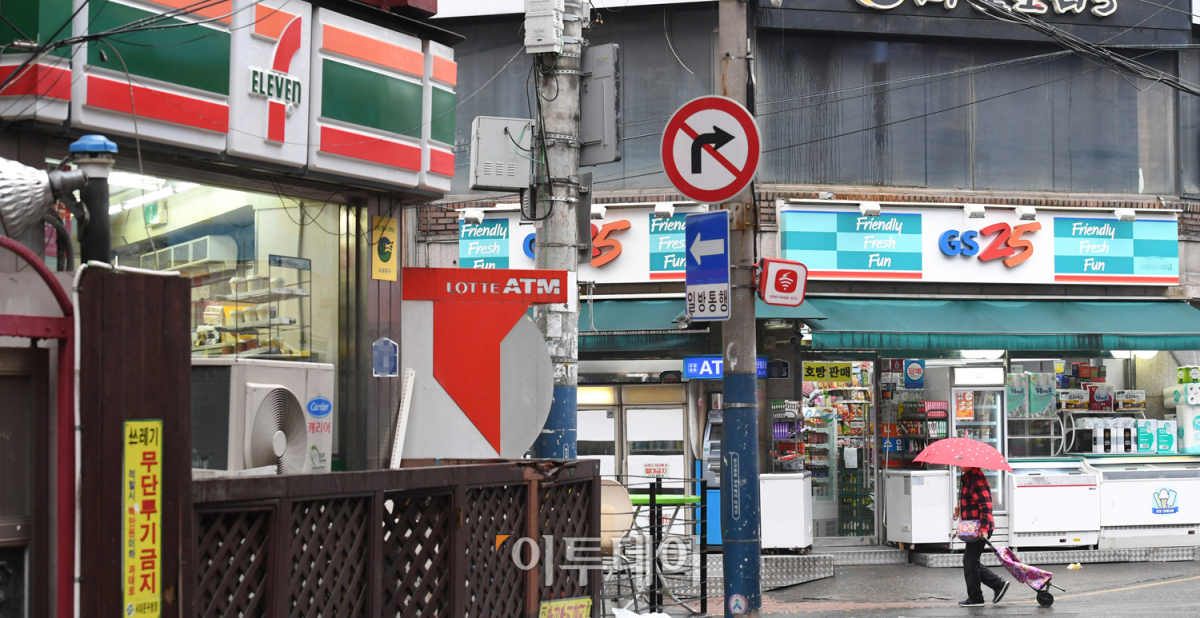 당정이 편의점의 무분별한 신규 출점으로 인한 과밀화를 막기 위해 '편의점 자율규약'을 마련했다. 공정위원회와 편의점 업계의 '편의점 자율규약 협약식'을 하루 앞둔 3일 오후 서울의 한 상가밀집지역에서 2개의 편의점이 10m 간격을 두고 영업하고 있다. 오승현 기자 story@