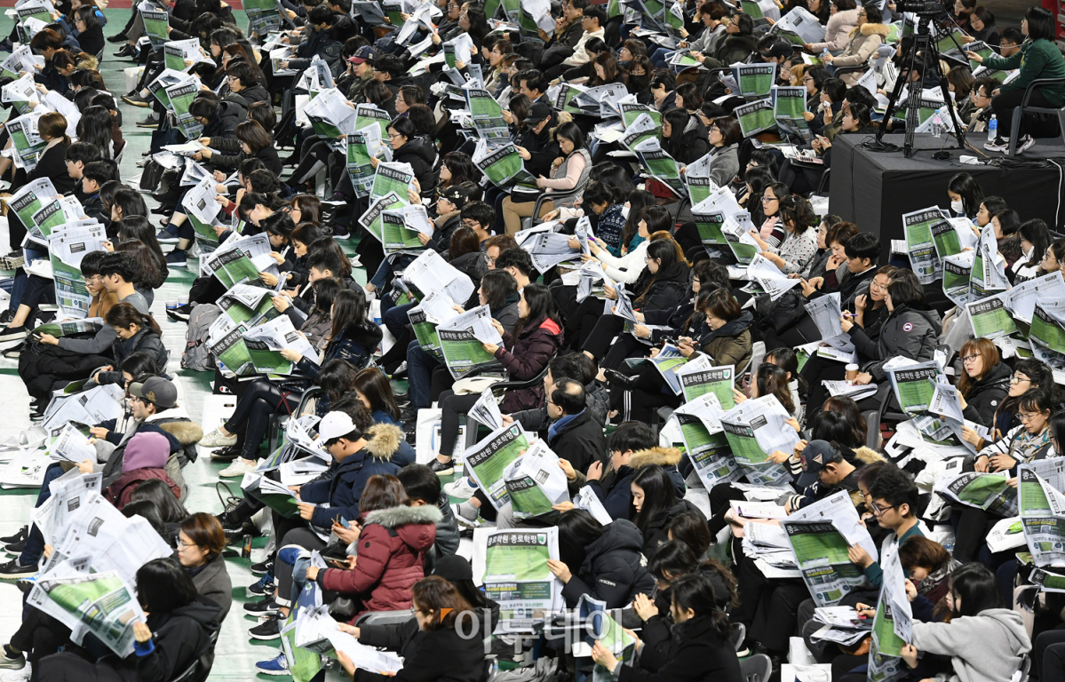 종로학원 주최로 '2019 정시지원전략설명회'가 열린 6일 오후 서울 송파구 잠실학생체육관에서 수험생과 학부모들이 수능 실채점 점수를 바탕으로 한 입시전문가의 정시 지원 전략을 경청하고 있다. 종로학원은 오는 15일까지 전국 주요 도시를 돌며 설명회를 개최한다. 오승현 기자 story@