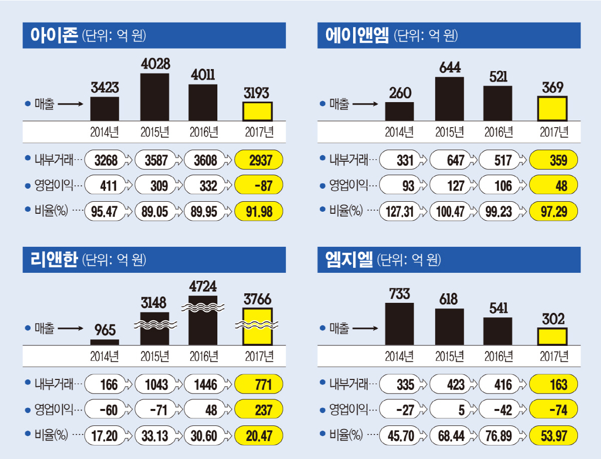 아이존은 지난해 전체 매출 3193억 원 중 91.98%에 해당하는 2937억 원을 내부거래로 올렸다. 내부거래 비율은 △2014년 95.47% △2015년 89.05% △2016년 89.95% 등이다.