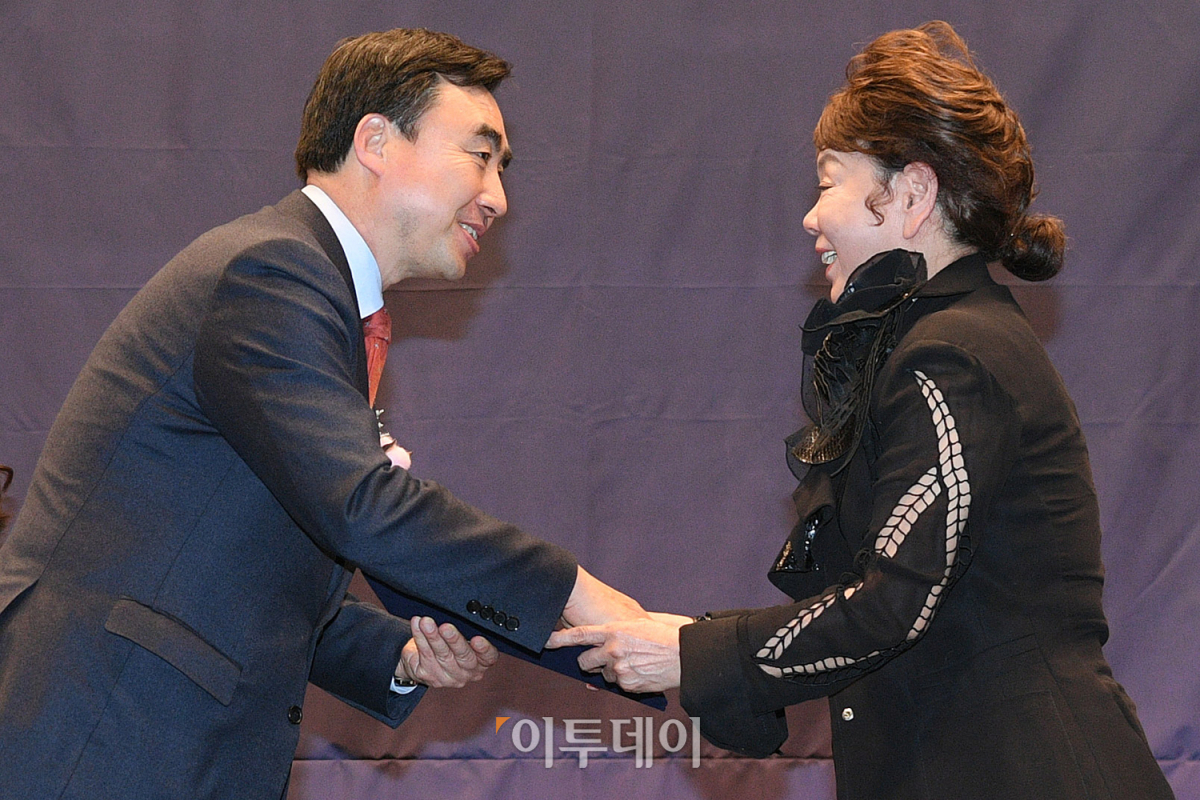 배우 김수미 씨가 7일 오후 서울 여의도 국회 헌정기념관에서 열린 '2018 대한민국 한류대상 시상식'에서 대중문화 공로 부문 특별상을 수상하고 있다. 시상자는 윤관석 국회의원. 오승현 기자 story@