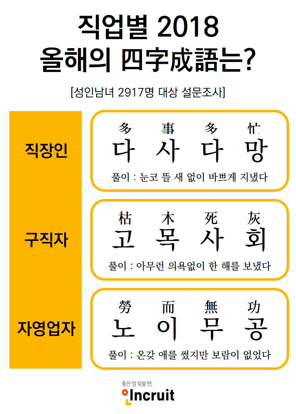 취업포털 인크루트가 설문조사플랫폼 두잇서베이와 공동으로 ‘올 한해 자신의 상태를 가장 잘 표현한 사자성어’를 묻는 설문조사를 진행했다. 2018년 12월 5일부터 7일까지 3일간, 성인남녀 총 2917명(직장인 1520명)이 참여했다.