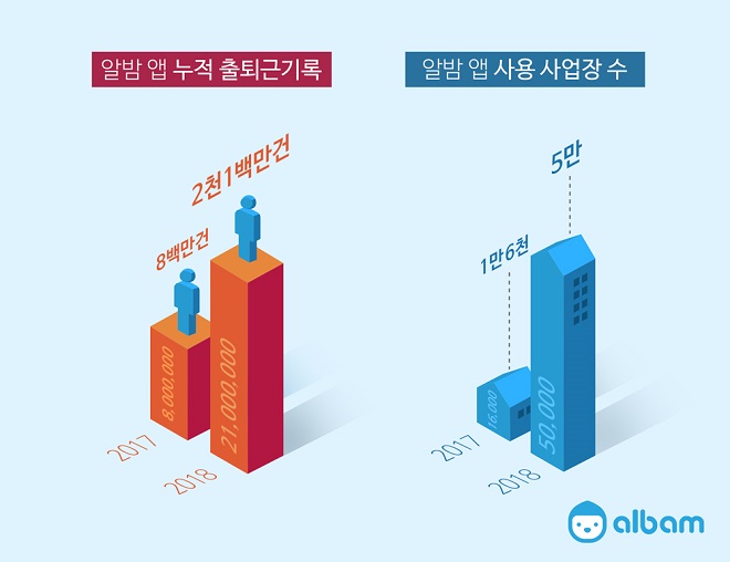 푸른밤 측에 따르면, 인사총무 담당자가 없어 근태에 따른 변동 급여 내역을 반영하기 어려운 소기업들이 전년 대비 많이 증가했다. 서비스 런칭 후 2018년도 말까지 누적 출퇴근 기록 수는 2100만 건에 달한다.