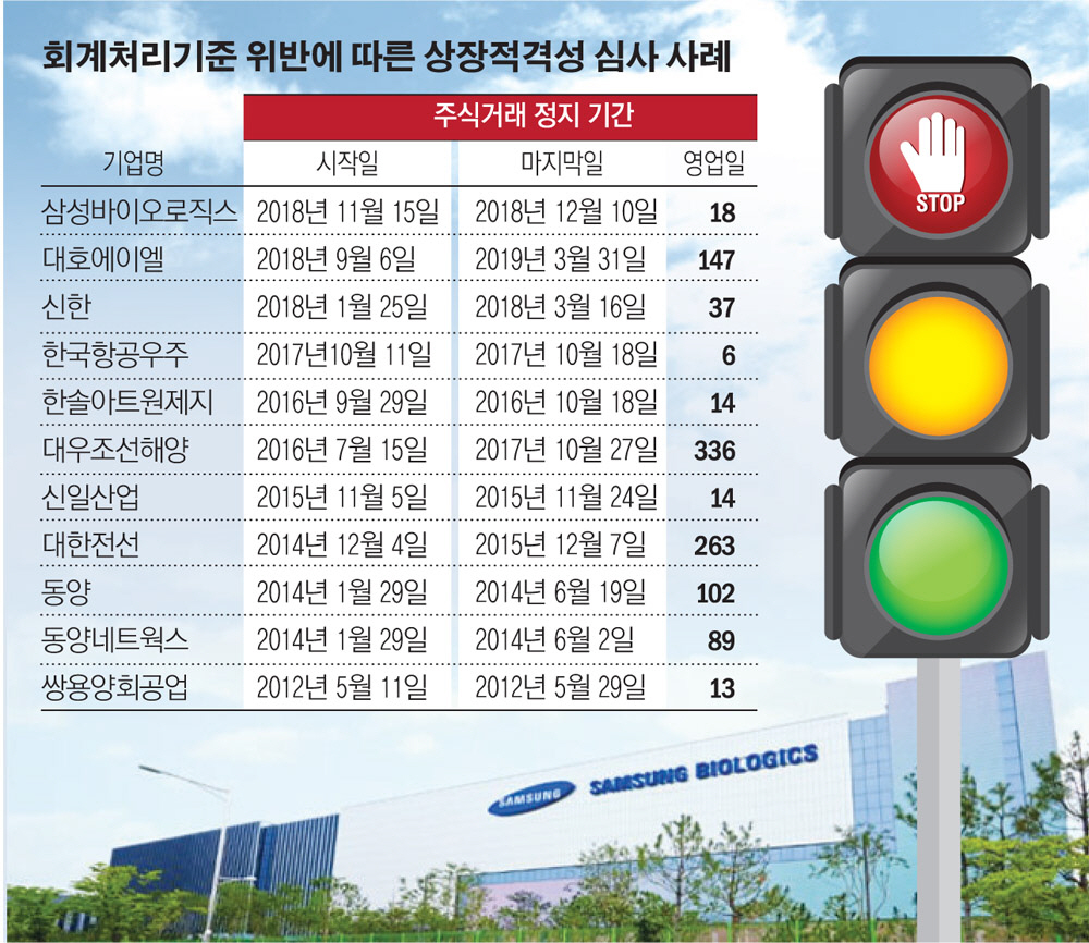 11일 전자공시시스템에 따르면 2000년 이후 회계처리기준 위반을 이유로 한국거래소의 상장폐지 여부 심사를 받은 기업은 총 17곳이다. 그러나 이날 거래가 재개된 삼성바이오로직스를 포함해 실제 상장폐지로 이어진 곳은 한 군데도 없었다.