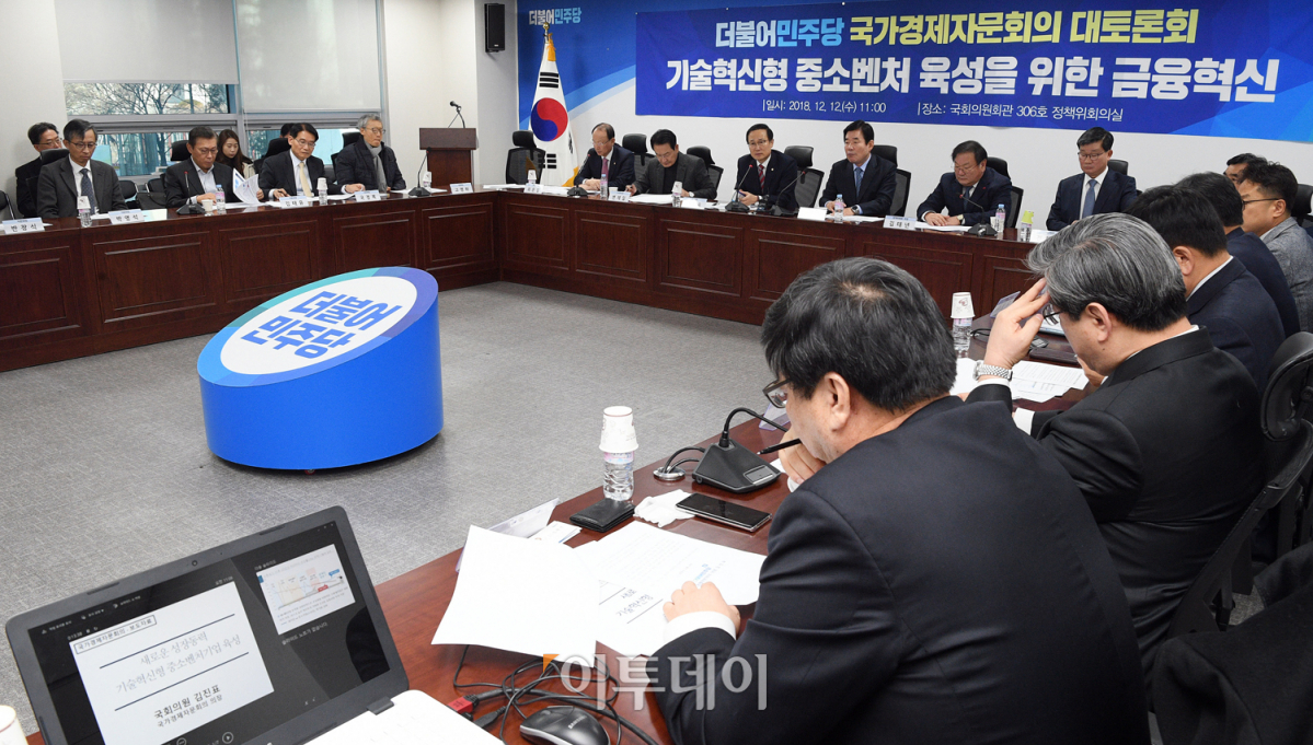 12일 오전 서울 여의도 국회의원회관에서 '더불어민주당 국가경제자문회의 대토론회'가 열리고 있다. '기술혁신형 중소벤처 육성을 위한 금융혁신'을 주제로 열린 이날 토론회에는 홍영표 더불어민주당 원내대표, 김태년 정책위의장, 김진표 국가경제자문회의 의장을 비롯해 민간국가경제자문위원 40여 명이 참석했다. 오승현 기자 story@