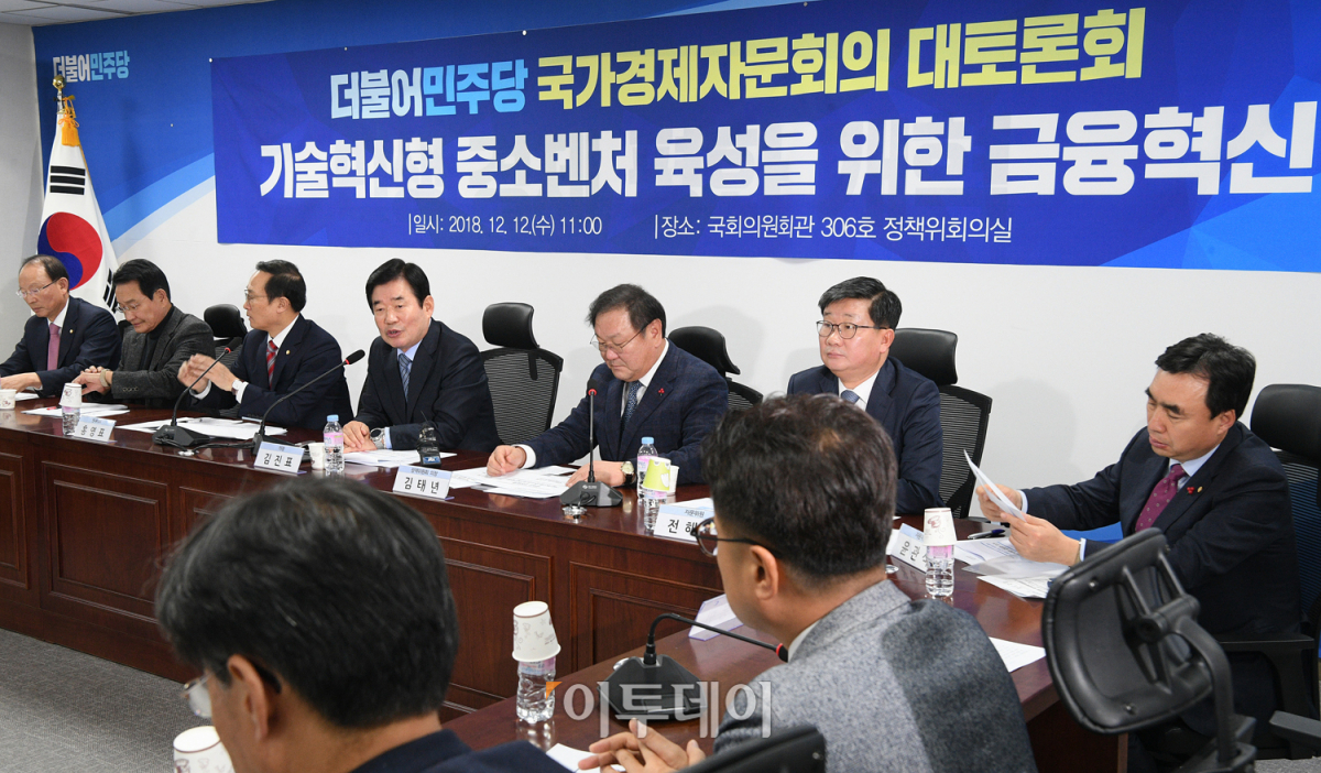 12일 오전 서울 여의도 국회의원회관에서 '더불어민주당 국가경제자문회의 대토론회'가 열리고 있다. '기술혁신형 중소벤처 육성을 위한 금융혁신'을 주제로 열린 이날 토론회에는 홍영표 더불어민주당 원내대표, 김태년 정책위의장, 김진표 국가경제자문회의 의장을 비롯해 민간국가경제자문위원 40여 명이 참석했다. 오승현 기자 story@