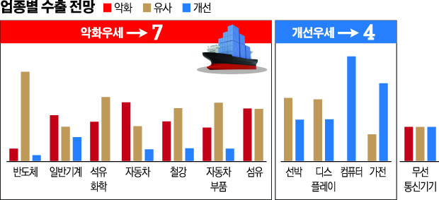 업종별로 살펴볼 때 내년도 수출 악화 전망이 개선 전망보다 우세한 업종은 7개로, △반도체 △일반기계 △석유화학 △자동차 △철강 △자동차부품 △섬유였다. 수출 개선 전망이 우세한 업종은 4개로 △선박 △디스플레이 △컴퓨터 △가전이다. 무선통신기기는 내년도 수출실적이 올해와 비슷한 수준을 보일 전망이다.