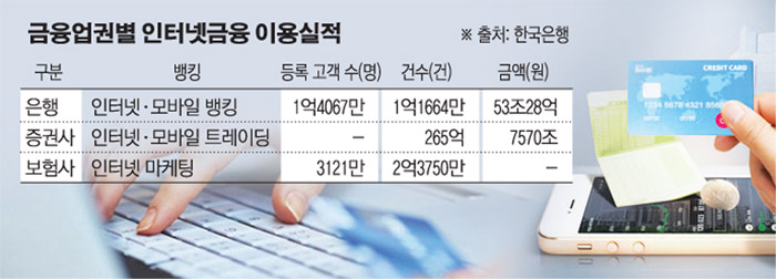 증권업권의 경우 지난해 말 기준 인터넷 트레이딩 건수는 총 265억 건인데 이 중 모바일을 이용한 트레이딩은 약 49%인 130억 건에 이르며, 금액은 전체 인터넷 트레이딩 금액(7570조 원)의 19.8%인 1501조 원이다.