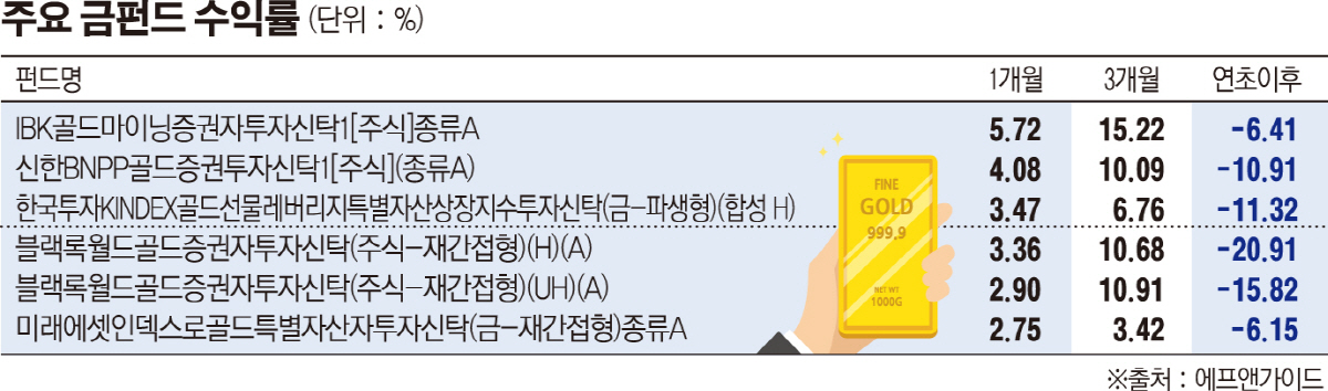 금 펀드 수익률도 최근 플러스로 전환했다. 14일 에프앤가이드에 따르면 IBK골드마이닝자1[주식]종류A의 연초 이후 수익률은 -6.41%, 6개월 수익률은 -3.85%로 집계됐다. 그러나 최근 1개월 수익률은 5.72%, 3개월 수익률은 15.22%다. 금 펀드 중 설정액이 가장 많은 블랙록월드골드증권자투자신탁(주식-재간접형)(H)(A)은 1개월 수익률이 3.36%, 3개월 수익률이 10.86%다.