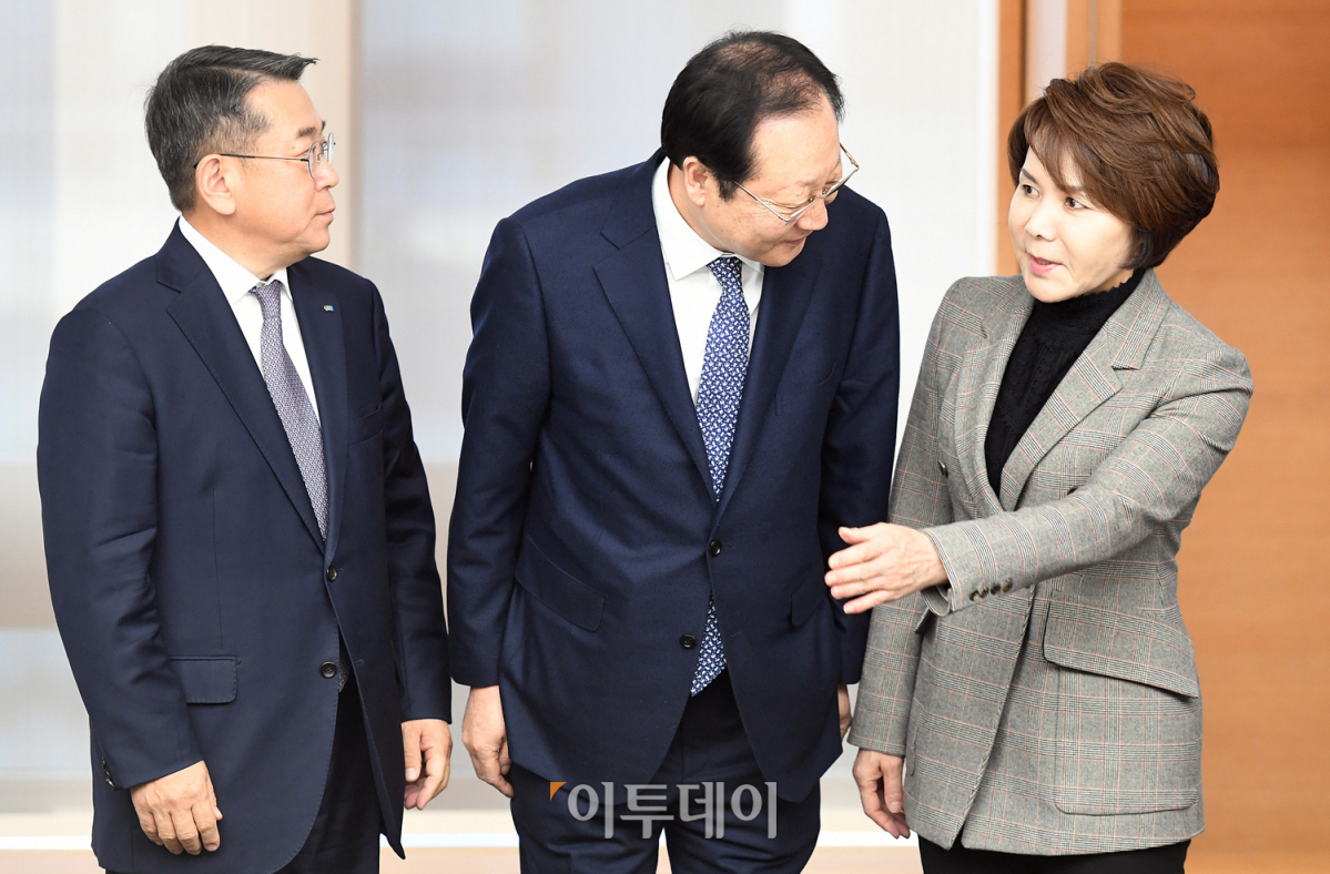 '권기홍 동반성장위원장 초청 간담회'가 열린 17일 오전 서울 중구 대한상공회의소에서 권(가운데) 위원장과 김준동(왼쪽) 대한상의 상근부회장, 정기옥 대한상의 중소기업위원장이 대화를 나누고 있다. 권 위원장은 이날 간담회에서 "우리 경제의 지속가능한 성장을 위해서는 자본뿐만 아니라 노동의 질적 제고를 통한 혁신성장이 필요하다"고 말했다. 오승현 기자 story@
