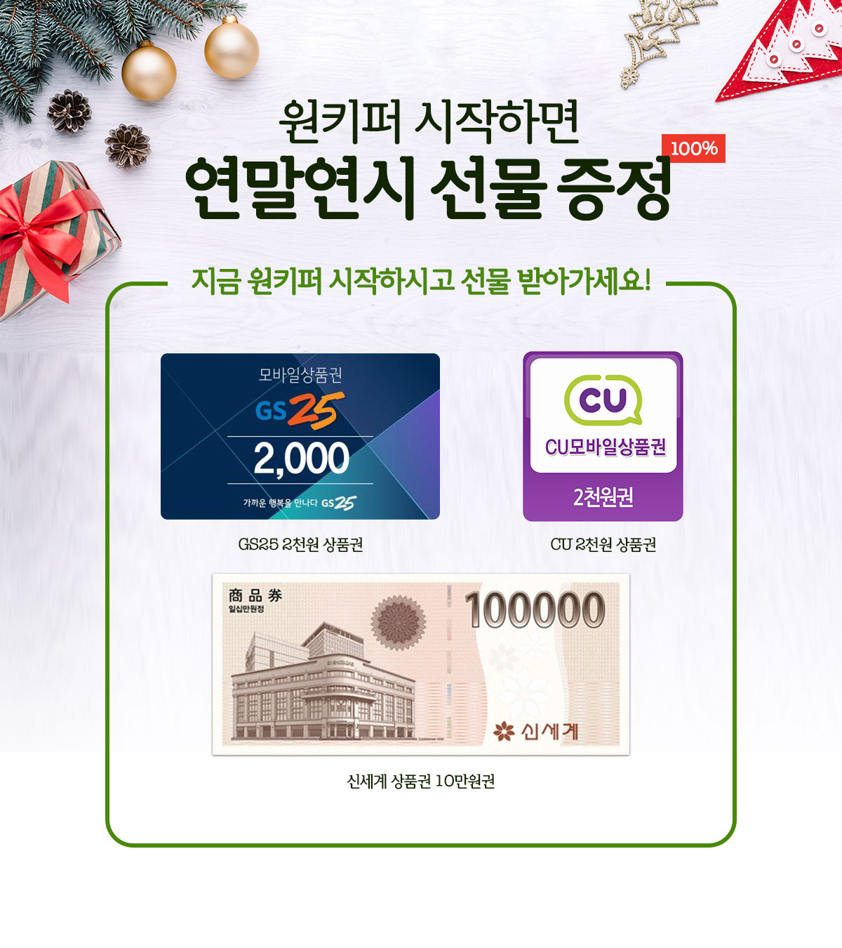 한편, 원키퍼는 연말연시를 맞아 신규 가입자에게 100% 선물을 증정하는 이벤트를 진행하고 있다. 신규 가입자는 서비스 가입 첫 단계에서 △GS25 상품권, △CU 상품권 중 자신이 받고 싶은 선물을 직접 선택할 수 있다. 또한 가입한 후 10일 이상 원키퍼 서비스를 유지한 2명을 추첨, 신세계 상품권 10만원을 증정할 예정이다.