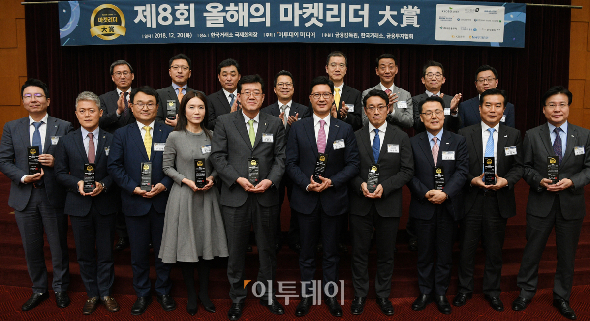 이투데이 미디어가 주최하고 금융감독원, 한국거래소, 금융투자협회가 후원한 '제8회 올해의 마켓리더 대상' 시상식이 20일 서울 여의도 한국거래소 국제회의장에서 열렸다. (뒷줄 왼쪽 세번째부터)김상철 이투데이 미디어 총괄대표, 정지원 한국거래소 이사장, 이상제 감융감독원 부원장, 권용원 한국금융투자협회 회장, 김군호 FN가이드 대표이사를 비롯한 내빈과 각 부문별 수상자들이 기념촬영을 하고 있다. 오승현 기자 story@