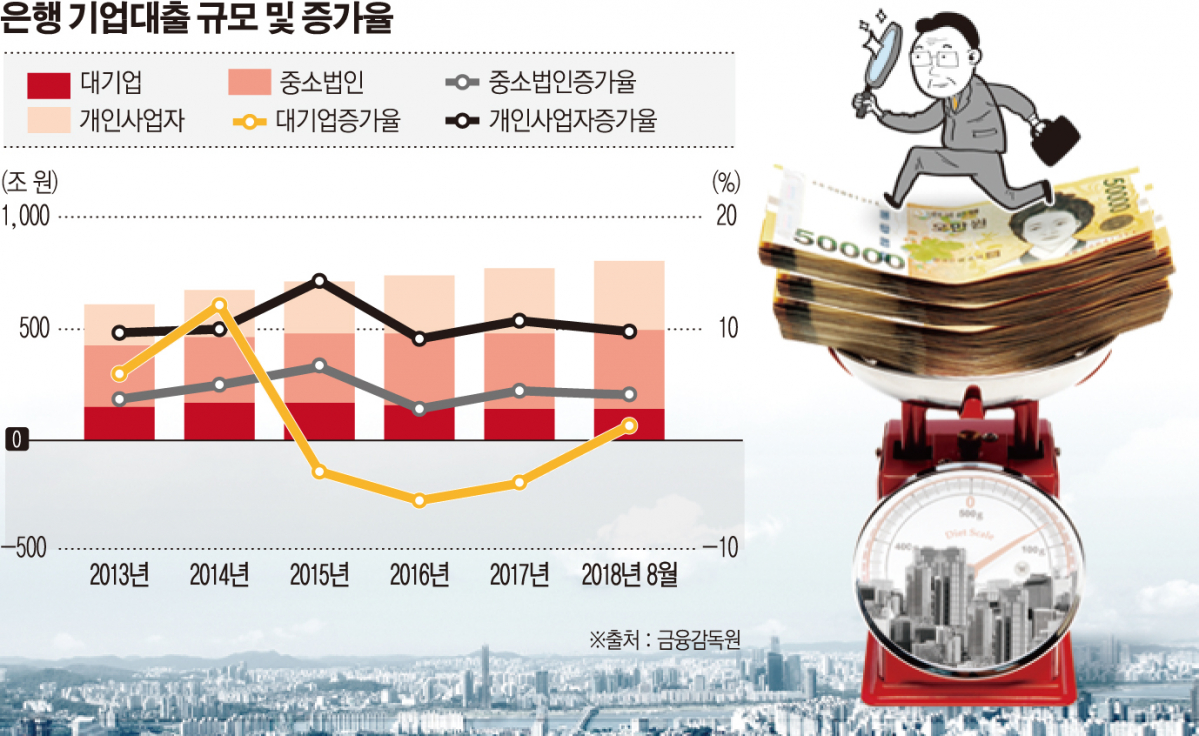 은행권이 중소기업으로 눈을 돌린 이유는 가계대출 규제가 강화된 탓이다. 금융위원회는 10월 31일부터 고(高) 총부채원리금상환비율(DSR)을 70%로 정해 관리하고 있다. 임대사업자 대출에 적용하는 이자상환비율(RTI)을 도입하고 관리도 강화했다.
