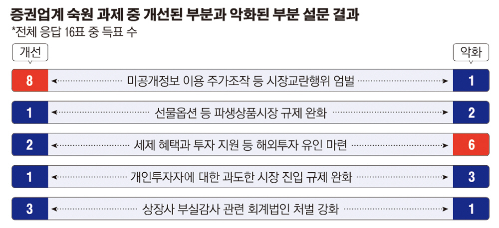 이투데이 설문조사에서 자본시장의 숙원 과제 중 가장 개선됐다는 평가를 받은 부분은 ‘미공개정보를 이용한 주가조작 등 시장교란행위 엄벌’로 전체 응답(16표) 중 8표를 얻어 압도적 1위를 차지했다.