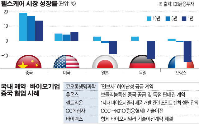 업계에 따르면 중국 의약품 시장의 연평균 성장률은 13.2%에 달하고, 2020년 300조 원 규모에 이를 것으로 추산된다. 중국은 이미 2013년 전 세계 의약품 시장의 11%를 차지하며 세계 2위의 의약품 시장으로 올라섰다. 그러나 GDP 대비 헬스케어 지출액 비중은 미국은 3분의 1 수준에도 미치지 못해 거대한 잠재력을 가진 시장이다. 중국의 65세 이상 인구는 2017년 기준 1억5000만 명에 달해 전체 인구의 10%를 돌파했다. 고령화사회에서 고령사회로 전환하면서 시장 규모는 갈수록 팽창할 것으로 보인다.