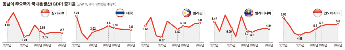 인도네시아, 말레이시아, 필리핀, 싱가포르, 태국 등 동남아 주요 5개국의 지난해 3분기 국내총생산(GDP) 증가율은 전년 동기 대비 평균 4.5%(연율 환산)로 집계됐다. 이들 국가의 평균 성장률은 2017년 3분기 5.5% 이후 줄곧 5%대를 유지하다 5개 분기 만에 처음으로 4%대로 떨어졌다. 뱅크오브아메리카 메릴린치는 동남아 5개국의 GDP가 지난해 5.1%, 올해 5.0%에서 2019년 4.8%로 둔화될 것으로 전망했다.