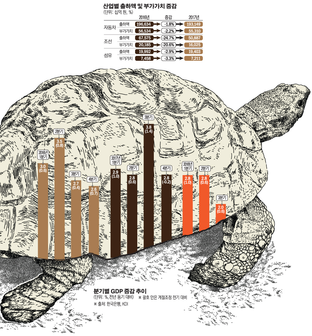 단기적으론 내수가 회복되기 어려울 것이라는 관측이 우세하다. 주력산업 기업들이 하루아침에 신시장에 진출하거나 생산품목을 전환하는 게 불가능하고, 최저임금의 급격한 인상과 경직적 근로시간 단축 등 ‘정책 실패’의 충격이 올해까지 이어질 가능성이 커서다.