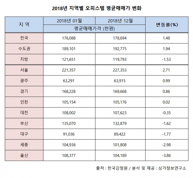 3일 수익형부동산전문기업 상가정보연구소는 한국감정원 통계를 분석한 결과 지난해 전국 오피스텔 평균매매가격이 1억7608만8000원(1월10일 기준)에서 1억7869만4000원(12월10일 기준)으로 1.48% 상승했다고 밝혔다.