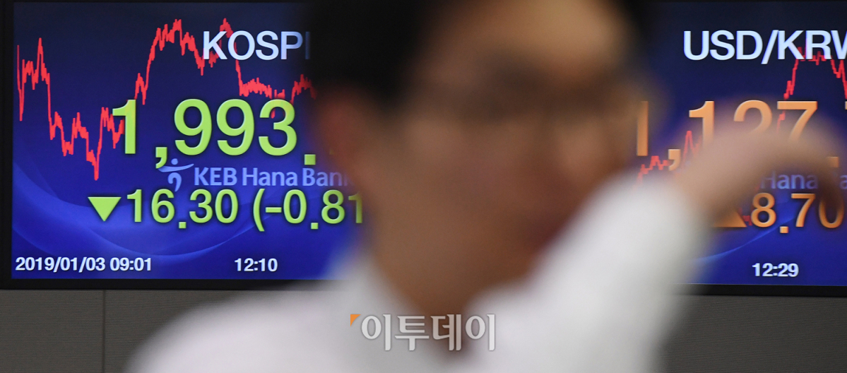 코스피 2000선이 지난해 10월 30일 이후 2개월여 만에 또다시 붕괴됐다. 3일 오후 서울 중구 KEB하나은행 딜링룸의 코스피지수 전광판에 전 거래일 보다 16.30포인트(0.81%) 하락한 종가 1993.70이 표시되고 있다. 오승현 기자 story@