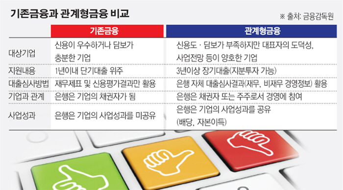 3일 금융권에 따르면 금감원은 ‘관계형 금융 가이드라인’에 이러한 내용을 담아 지난해 말부터 시행하고 있다. 관계형 금융은 은행이 담보나 보증 없이 기업의 잠재력을 보고 장기 대출과 지분 투자, 컨설팅 등을 해주는 제도다.