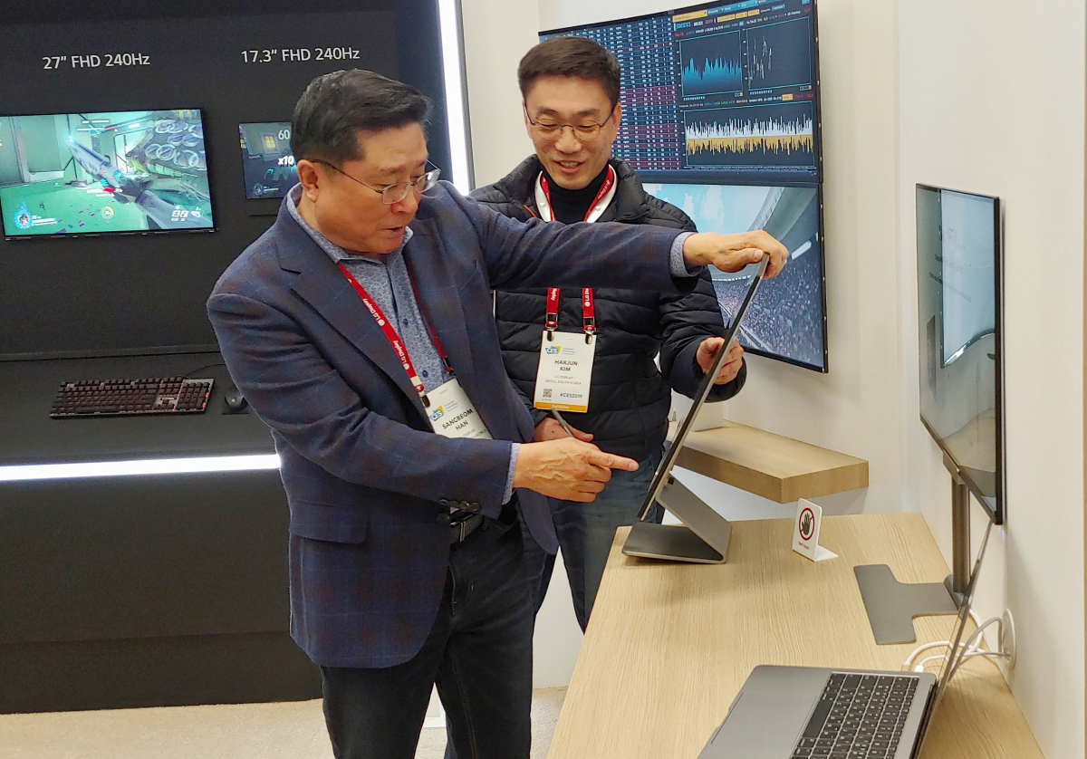 한상범 LG디스플레이 부회장이 현지시간 8일부터 11일까지 미국 라스베이거스에서 열리는 'CES 2019' 현장에서 27인치 네오아트 포터블 모니터 디스플레이를 살펴보며 전시회 개막전 사전 현장점검을 하고 있다. 사진제공=LG디스플레이