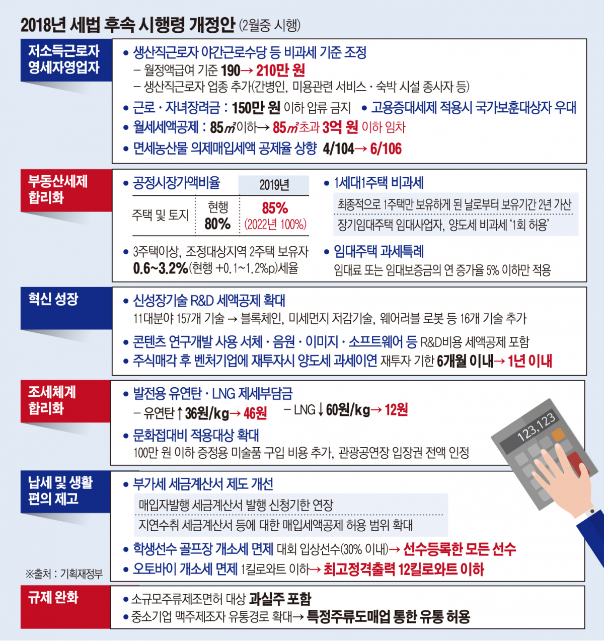 반면 혁신성장 차원의 세액공제는 확대된다. 신성장기술 연구개발(R&D) 적용 대상에 블록체인, 미세먼지 저감기술, 웨어러블 로봇 등 16개 기술이 추가되고, 문화산업 창작 R&D에 사용되는 서체·음원·이미지·소프트웨어 등의 대여·구입비도 R&D 세액공제 대상에 포함된다. 주식 매각 후 해당 매각대금을 벤처기업에 재투자 시 양도세 과세이연기간은 6개월에서 1년으로 연장된다.