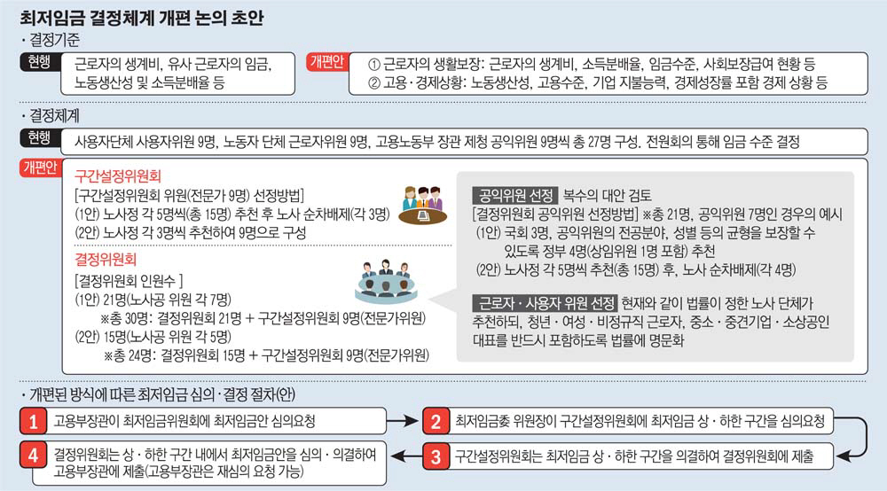 단일 심의체인 최저임금위를 전문가 집단인 구간설정위원회와 이해관계자 그룹인 결정위원회로 분리하는 것이다. 전문가들이 최저임금 인상 범위를 정하면 이해관계자들이 인상률을 확정하는 구조다.