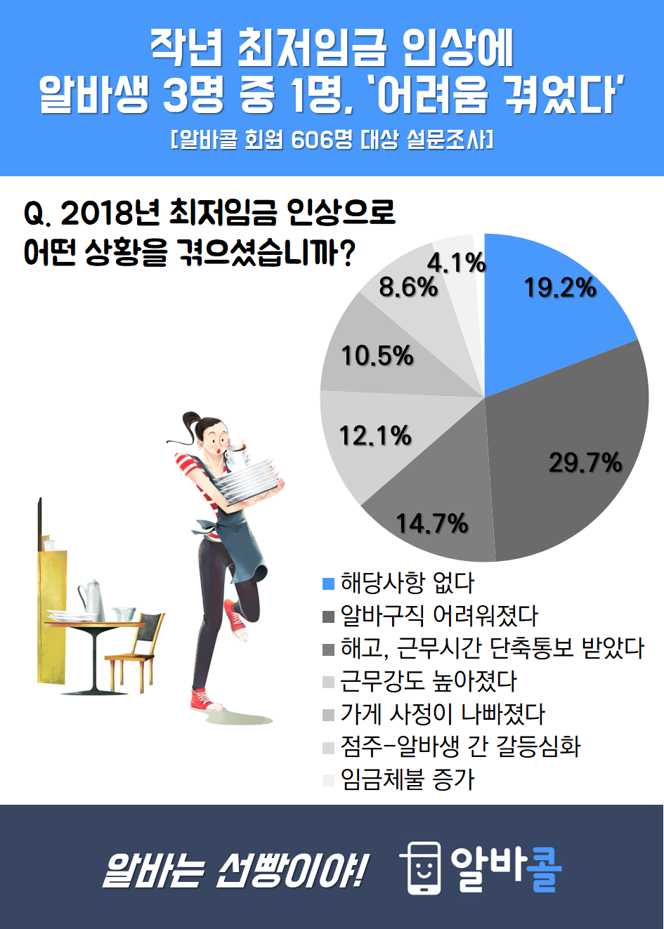 ‘다음 중 2018년 최저임금 인상으로 겪은 상황은 무엇입니까’(단일선택)라는 질문에 ‘해당사항이 없다’고 대답한 아르바이트생은 19.2%였다. 나머지 80.8%는 어려움을 겪었다는 것인데, 이는 응답한 아르바이트생 5명 중 4명에 달하는 규모다.