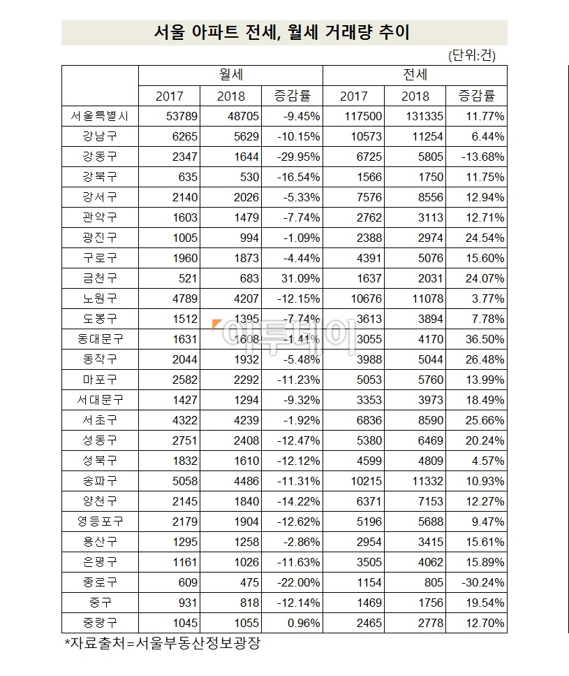 9일 서울부동산정보광장에 따르면 작년 한 해 서울 아파트의 월세 거래량은 4만8705건으로 2017년(5만3789건)보다 9.45% 줄었다. 반면, 같은 기간 전세는 11만7500건에서 13만1335건으로 11.8% 늘었다.