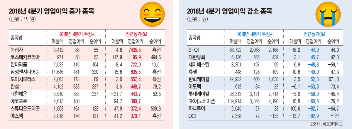 코스메카코리아(1195.9%), 코스맥스(137.6%), 한국콜마(128.3%) 등 화장품주들도 작년 4분기 영업이익이 전년 동기 대비 크게 증가할 것으로 증권가에서는 보고 있다. 이들 기업은 올해 1분기 영업이익 전망치도 증가하는 모습이다. 삼성엔지니어링, 삼성전기, 기아차, 현대모비스, 포스코켐텍 역시 증권가에서 실적을 높게 전망하는 기업들이다. 반면 4분기 영업이익이 전년 동기 대비 감소할 것으로 예상되는 기업은 60곳으로 OCI, S-Oil, 대한유화, 세아베스틸, 한화케미칼,롯데케미칼, SK이노베이션 등이다.