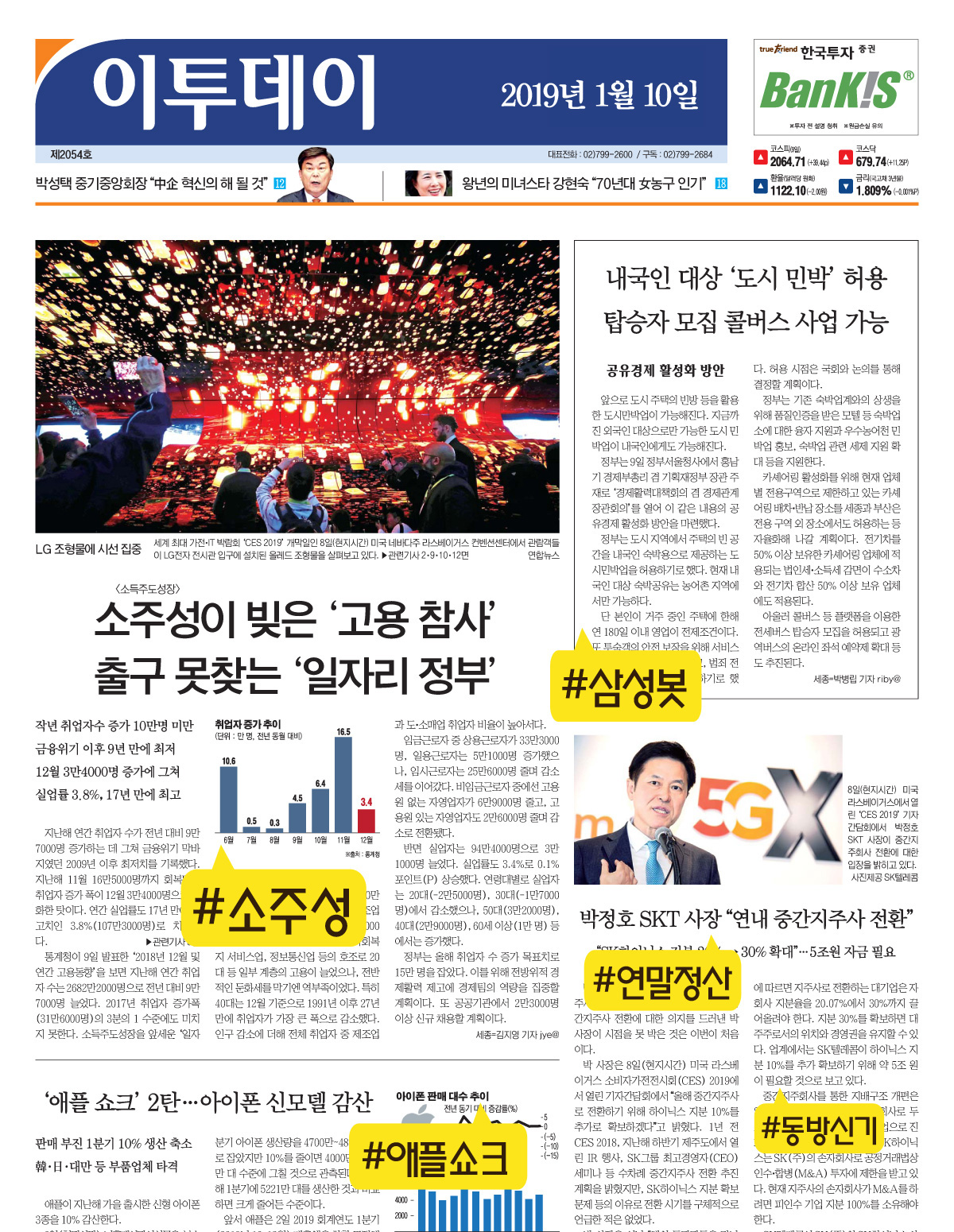 오늘(10일) 이투데이에서는 조간 주요 경제 기사로 ‘소주성이 빚은 고용 참사…출구 못찾는 일자리 정부’, ‘삼성봇 선보인 김현석 사장 “AI 로봇 연내 상품화”’, ‘애플쇼크 남의 일?…팀 쿡 셀프 성과급 눈총’, ‘연말정산 스타트…국세청, 15일 간소화 서비스 오픈’, ‘제주항공 명예사원 된 동방신기…첫 업무는 번들서비스 이름짓기’ 등을 꼽아 봤다.
