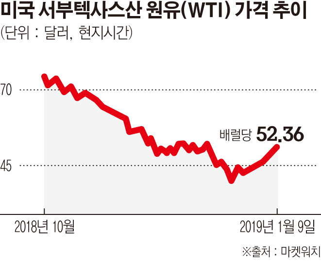 월스트리트저널(WSJ)에 따르면 WTI는 8거래일째 올라 지난달 13일 이후 최고치를 기록했다. 또 최근 저점인 지난달 24일의 배럴당 42.53달러에서 23% 상승하면서 강세장에 진입했다. 여전히 WTI는 지난해 10월 초 찍었던 4년 만의 최고치 배럴당 76.41달러보다는 31% 낮은 상태다. 글로벌 유가 벤치마크인 브렌트유 가격은 4.6% 뛴 배럴당 61.44달러로, 역시 지난달 13일 이후 최고치를 나타냈다.