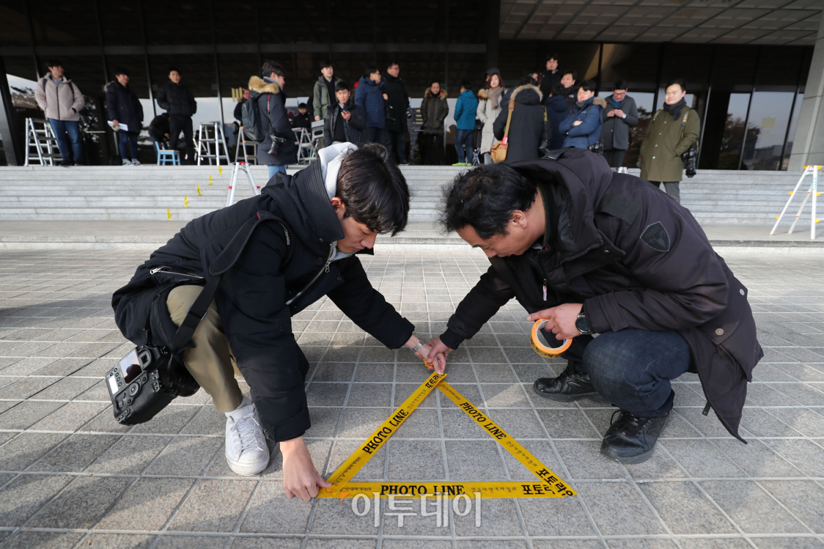 헌정사상 처음으로 전 대법원장이 피의자 신분으로 검찰 조사를 받는다. 양승태 전 대법원장의 검찰 소환조사를 하루 앞둔 10일 오후 서울 서초구 서울중앙지방검찰청에서 취재진이 포토라인을 설치하고 있다. 한편 양 전 대법원장은 이 포토라인이 아닌 대법원에서 대국민 입장을 발표할 예정이다. 오승현 기자 story@
