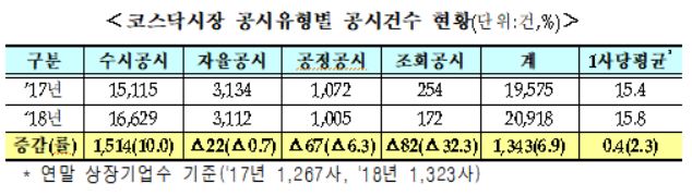 13일 한국거래소에 따르면 작년 한 해 코스닥시장 상장법인 전체 공시건수는 2만918건으로 전년 대비 1343건(6.9%) 증가했다. 기업당 평균 공시건수는 15.8건으로 0.4건 늘었다.