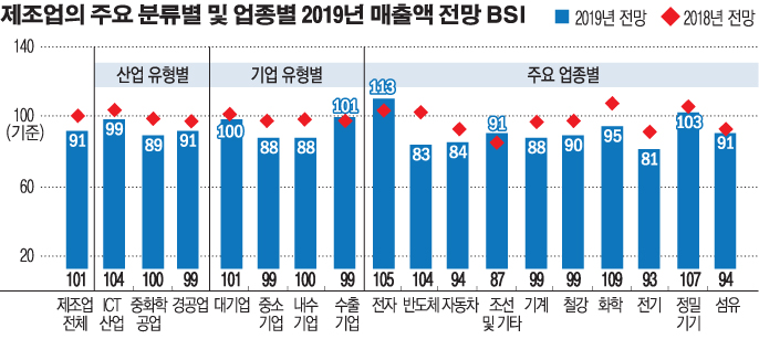 주요 업종별로는 전자(113)와 정밀기기(103)만이 100을 넘겼을 뿐 반도체(83)를 비롯한 자동차(84), 기계(88), 철강(90), 화학(95) 등 대다수 업종이 100를 하회해 비관적으로 조사됐다. 다만 이중 조선·기타운송(91)은 전년도(87)에 비해 부정적 전망이 약화됐다.