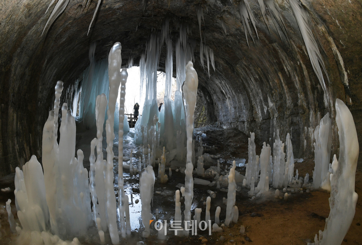 휴일인 13일 오후 경기 연천군 신서면 대광리 고대산 중턱의 한 폐터널에서 땅에서 솟아오르는 종유석 모양의 역고드름을 관광객들이 살펴보고 있다. 역고드름은 천정에서 떨어지는 물이 땅에 떨어지며 얼어붙어 생성되는 것이다. 오승현 기자 story@