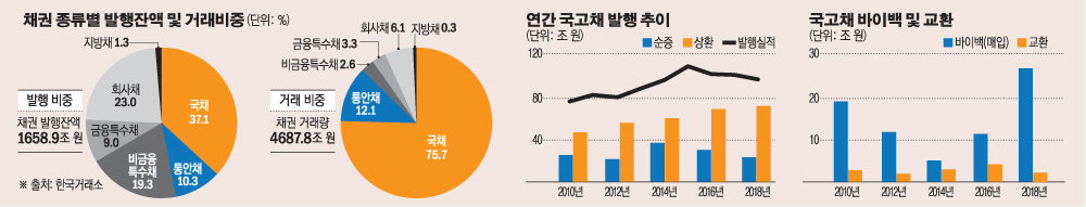 이후 국채시장은 비약적 발전을 거듭했다. 1997년 2조1000억 원이던 연간 국고채 발행량은 2015년 109조3000억 원을 기록하며 50배 넘게 성장했다. 2017년말 기준 상장채권 발행잔액은 1658조9000억 원, 거래량은 4687조8000억 원으로 이중 국채 비중은 각각 37.1%(국고채 33.0%)와 75.7%(국고채 67.9%)를 차지하고 있다.
